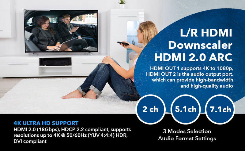 4K to 1080p Downscale (Output 1) – Automatically adapts to 1080p displays while maintaining 4K source input