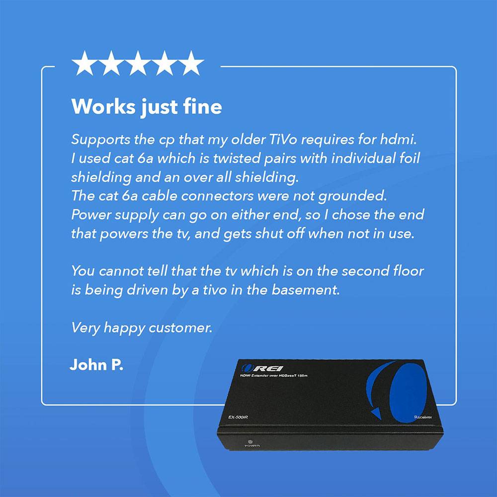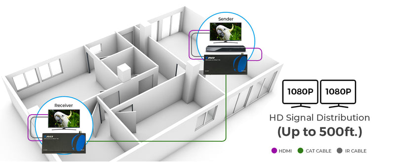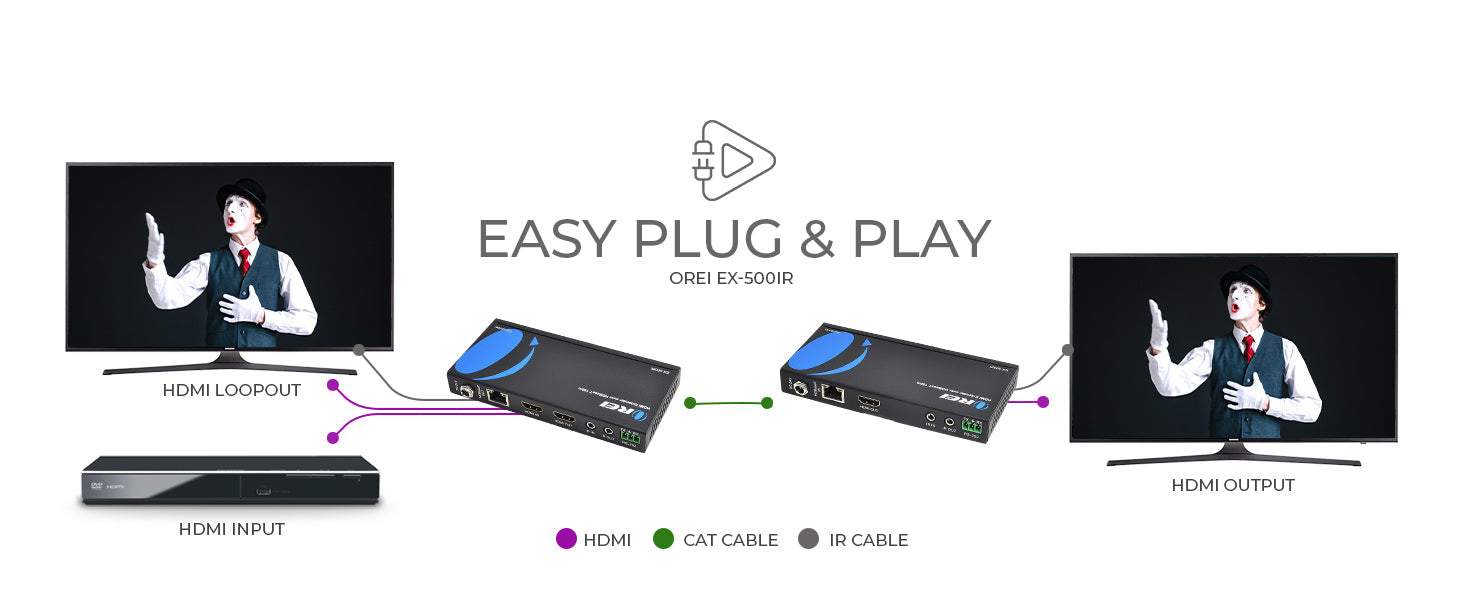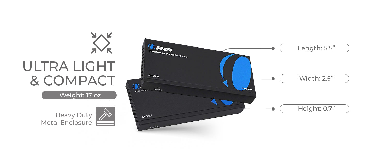 The OREI EX-500IR is a professional 1080p HDMI extender that transmits Full HD signals up to 492 feet (150 m) over a single CAT 6/7 cable. It's an ideal solution for home AV systems, classrooms, and digital signage setups that require HDMI over Cat 6 extender performance with uncompromised clarity and range.