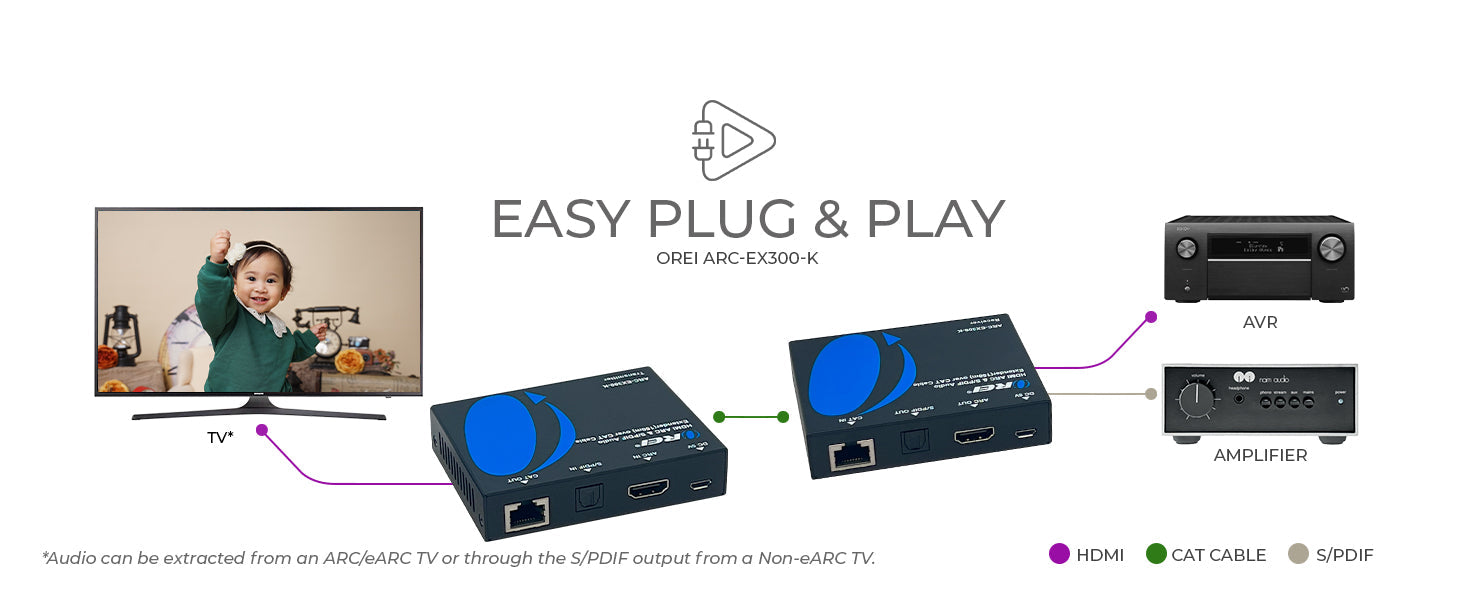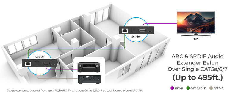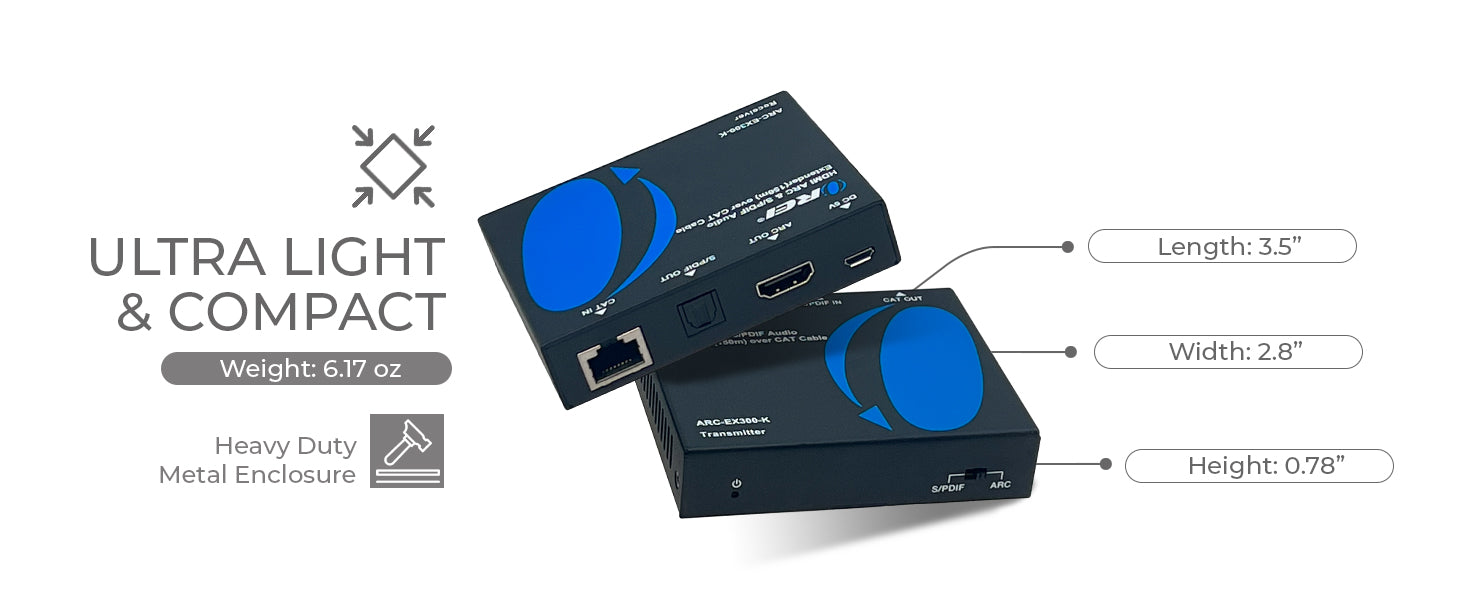 The ARC-EX300-K HDMI ARC extender transmits high-resolution ARC audio up to 492 feet (150 meters) at 96kHz or 295 feet (90 meters) at 192kHz using a single CAT cable. It's the perfect arc over Cat6 solution for routing audio from your TV to an external amplifier or receiver without loss of quality—ideal for home theaters, conference rooms, and whole-home AV systems.