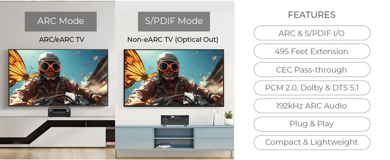 The ARC-EX300-K is a compact HDMI ARC and S/PDIF audio extender designed to deliver high-fidelity audio transmission over long distances. Capable of extending HDMI ARC signals up to 492 feet (150 meters) at 96kHz or 295 feet (90 meters) at 192kHz over a single CAT cable, it offers a reliable, plug-and-play solution for routing audio from a TV back to an amplifier, AVR, or multi-room audio system.
