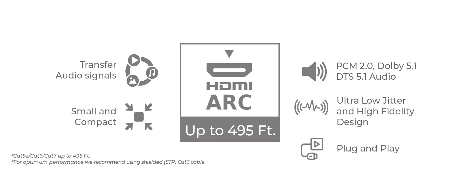 Extends HDMI ARC signals up to 495 feet (96kHz) or 295 Feet (192kHz)