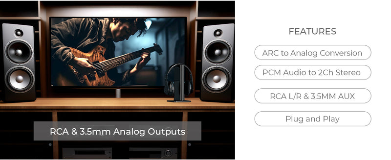 Supporting PCM audio, the DA25 converts digital signals into 2-channel stereo without distortion. With dual analog outputs—RCA and 3.5mm stereo jack—it offers flexible connection options for amplifiers, stereo systems, soundbars, and headphones. Perfect for those upgrading setups without HDMI ARC support.