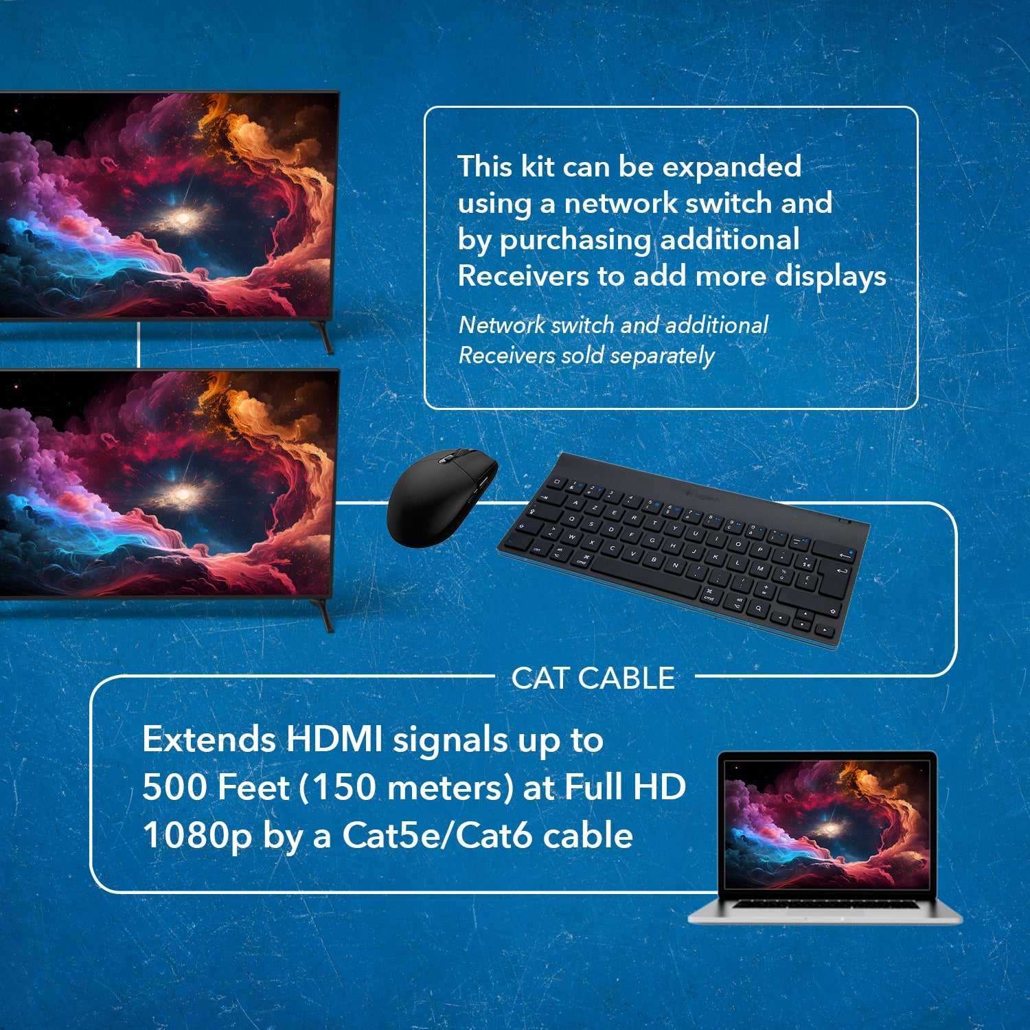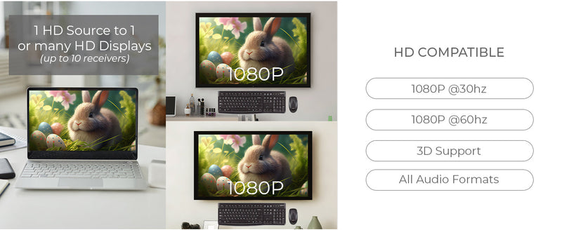 Long-Distance Extension up to 150m (492ft) – Reliable transmission over a single Cat5e/6 cable.