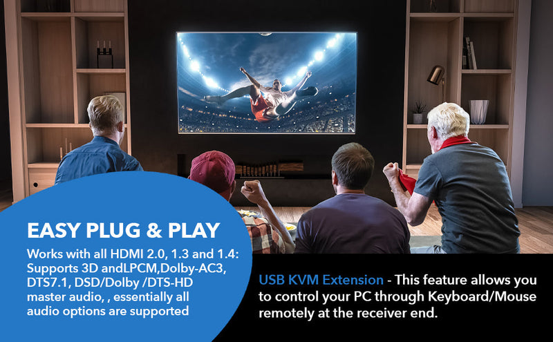 - Extended Transmission Distance – Up to 492 ft (150 m) at 1080p@60Hz, or 394 ft (120 m) at 4K@60Hz, using a single CAT6 cable.1