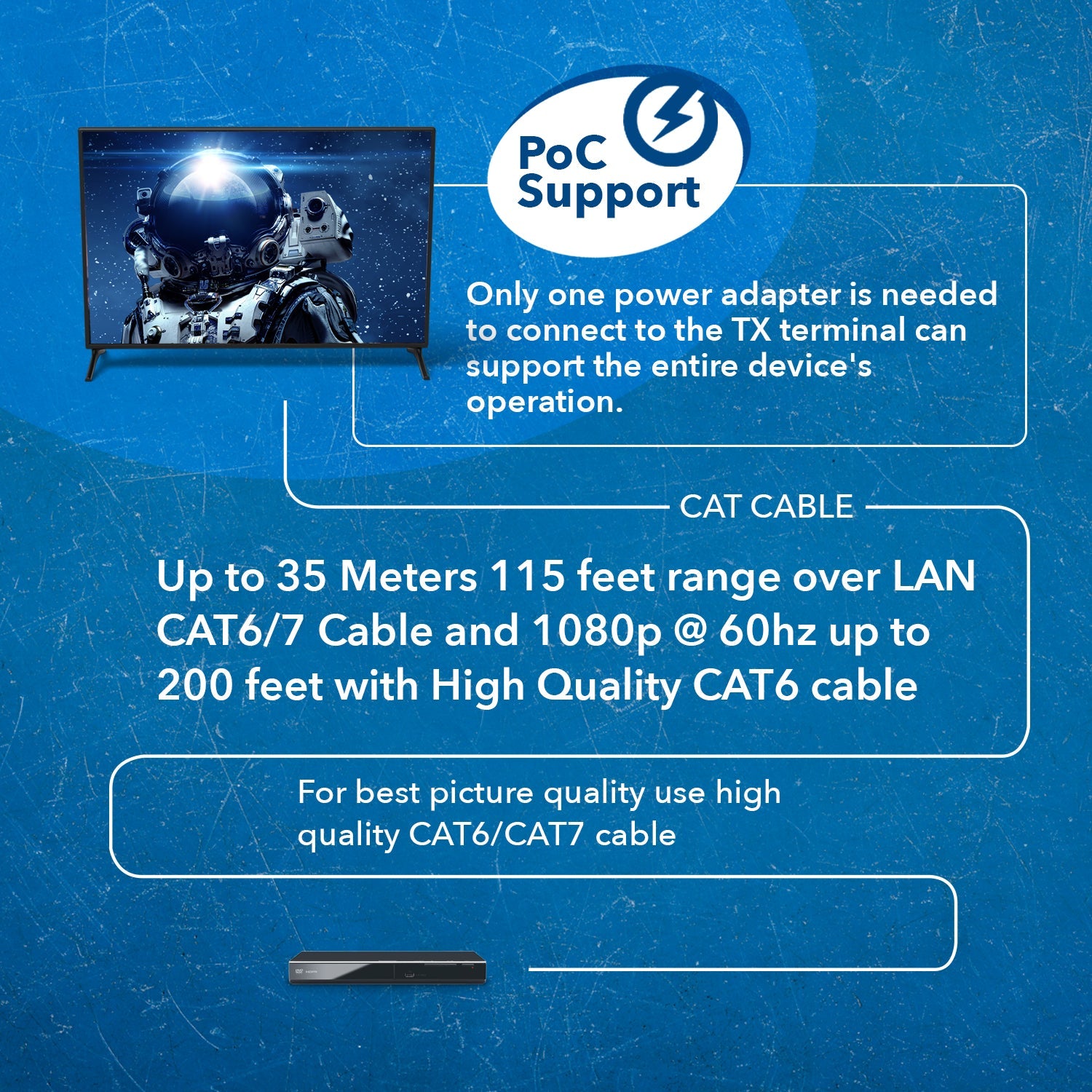 Ideal for home or commercial installations, it extends HDMI signals up to 115ft at 4K@60Hz and 230ft at 1080p@60Hz.This extender includes an HDMI loop-out on the transmitter for connecting a local display and supports audio de-embedding through the L/R output on the receiver. With bi-directional Power over Cable (PoC), only one power adapter is needed. It also enables full control flexibility with bi-directional IR, RS-232, and CEC pass-through.