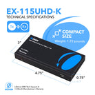The EX-115UHD-K HDMI extender delivers stunning, uncompressed video quality, supporting resolutions up to 4K@60Hz (4:4:4) with full HDR, HDR10+, Dolby Vision, and HLG passthrough. Fully HDMI 2.0b and HDCP 2.2 compliant, it ensures compatibility with the latest AV devices and content protection standards. Whether you're streaming movies, hosting presentations, or installing digital signage, this HDMI over Ethernet 4K solution guarantees exceptional image clarity.