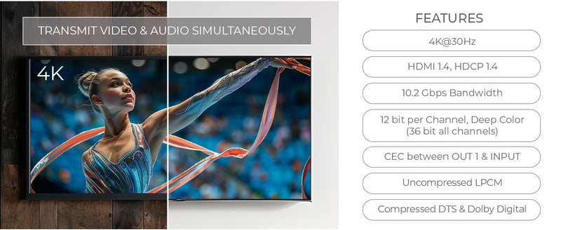 Fully compliant with HDMI 1.4 and HDCP 1.4, it supports video resolutions up to 4K@30Hz & 1080p@60Hz and delivers smooth signal transmission with 10.2Gbps bandwidth.