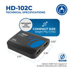 The HD-102C is a compact 1x2 HDMI splitter that mirrors a single HDMI source to two displays simultaneously.