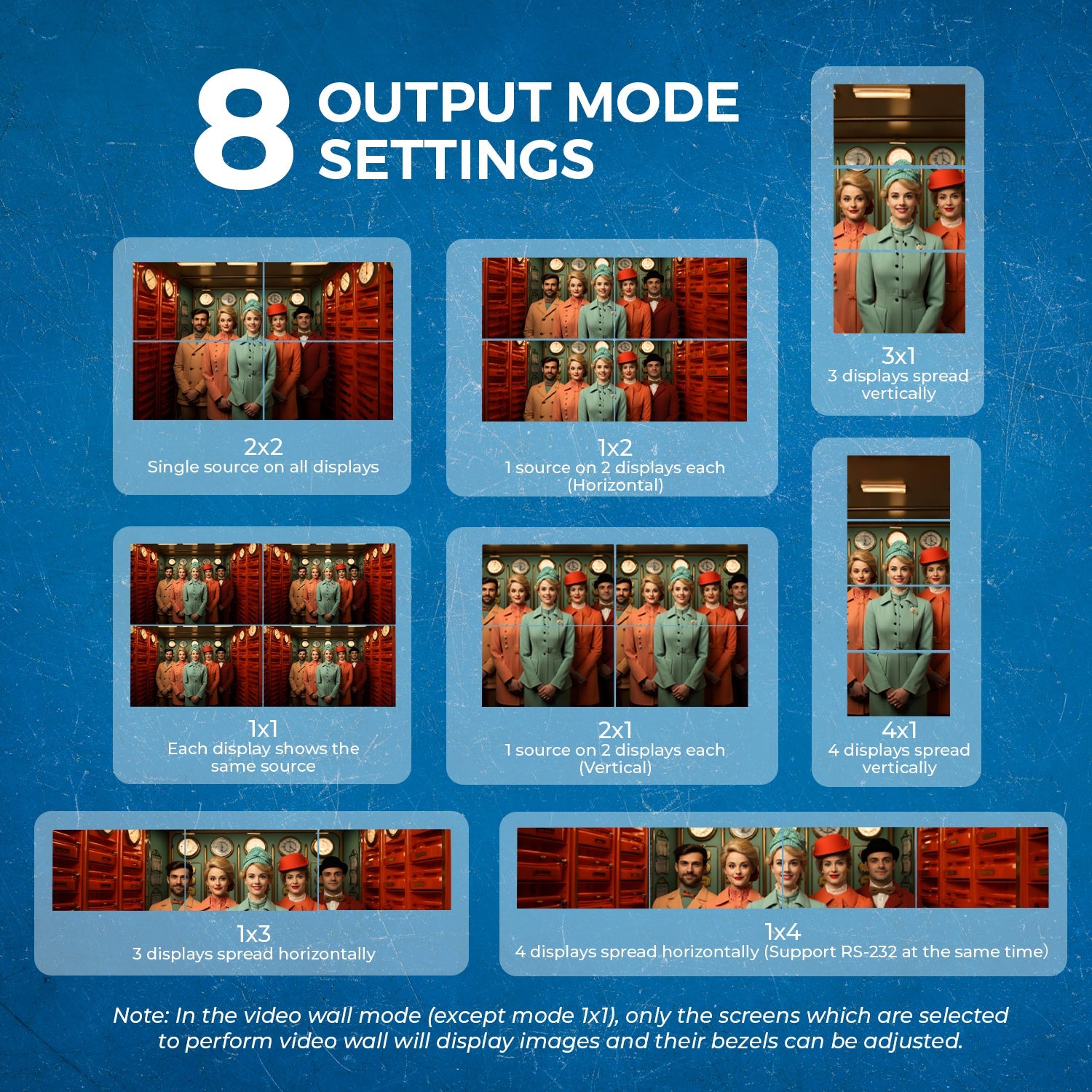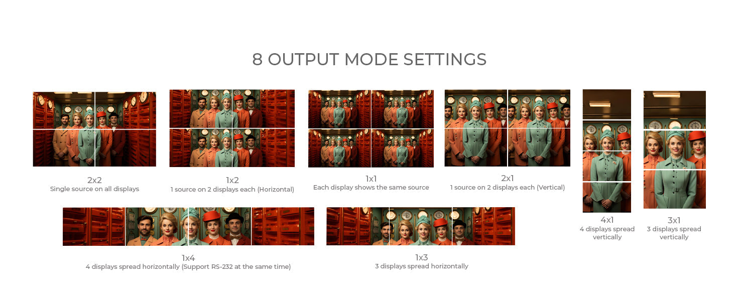 8 Video Wall Modes – Supports configurations including 2x2, 1x4, 4x1, and more.