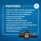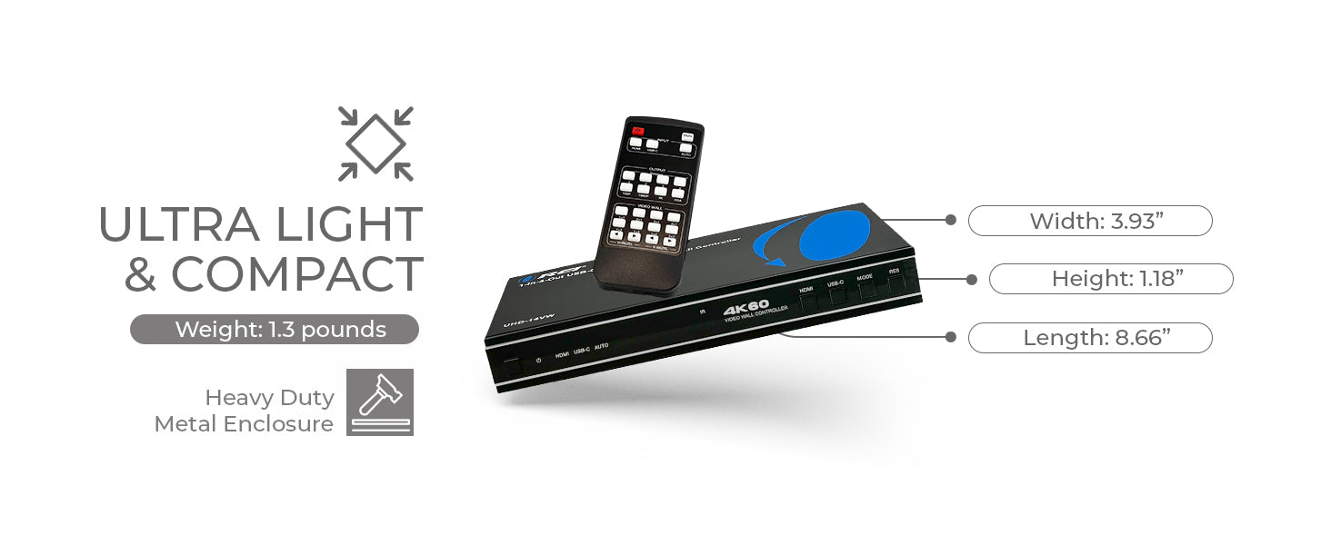 Equipped with both HDMI and USB-C inputs, the UHD-14VW offers broader compatibility across modern media sources. It supports 8 different video wall layouts including 2x2, 1x4, and 4x1, and includes 180-degree rotation and bezel compensation features for seamless screen alignment. Audio can be extracted via Optical or 3.5mm stereo outputs. Control is simple via front panel buttons, the included IR remote, or RS-232 commands. With a compact and plug-and-play design, the UHD-14VW is ideal for both commercial signage and immersive home displays.