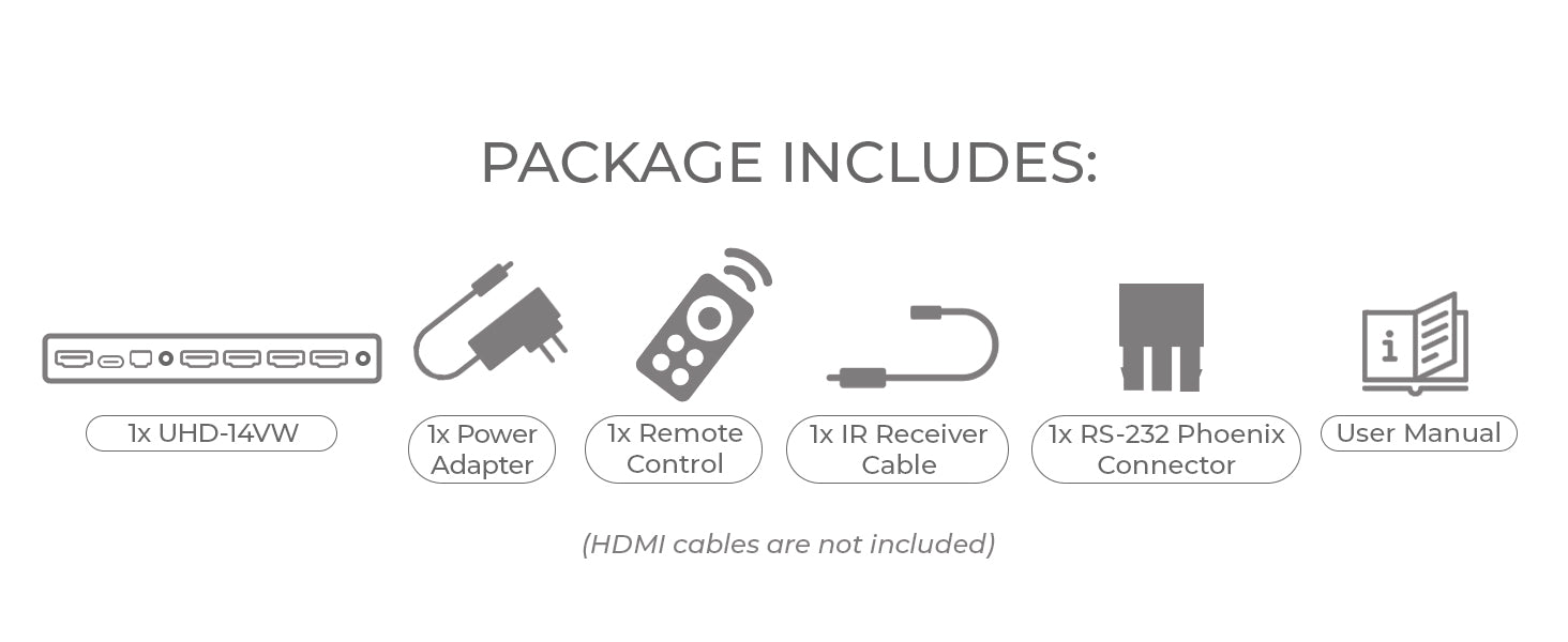 With its plug-and-play design, the UHD-14VW requires no software or drivers, making installation quick and easy. For convenient operation, you can control the unit via the front panel buttons, included IR remote, or RS-232 commands. Whether you're configuring a video wall 2x2 for a conference room or a multi-display setup for an event, this intuitive controller makes setup and control simple and efficient.
