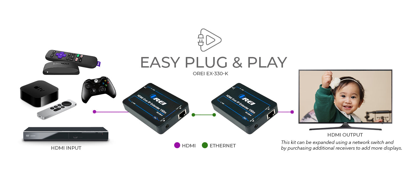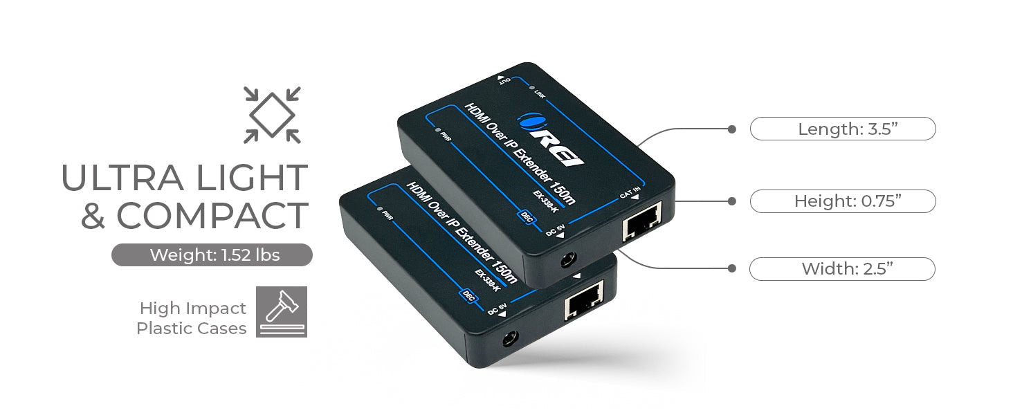 The EX-330-K is a high-performance HDMI over IP extender that transmits 1080p@60Hz video up to 492 feet (150 meters) over a single CAT5e or CAT6 cable. It's the ideal solution for reliable long-distance AV signal transmission, whether you're setting up HDMI through Ethernet in commercial, educational, or residential environments.