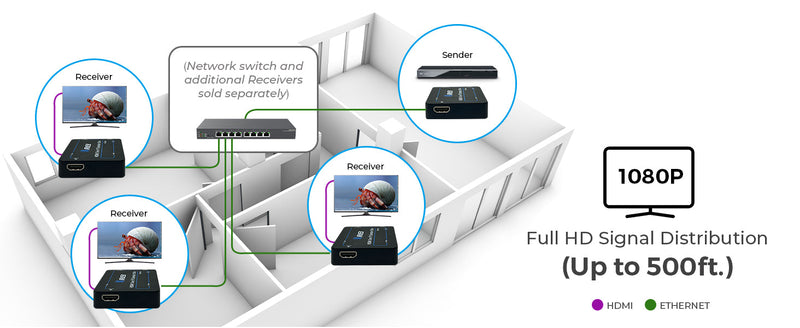 Designed for versatility, this HDMI IP extender supports both one-to-one and one-to-many setups, giving you complete control over your AV layout. It works seamlessly with standard 1G network switches, routers, or hubs—enabling scalable and cost-effective deployment across large spaces or multiple rooms.