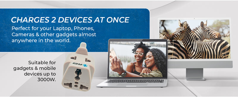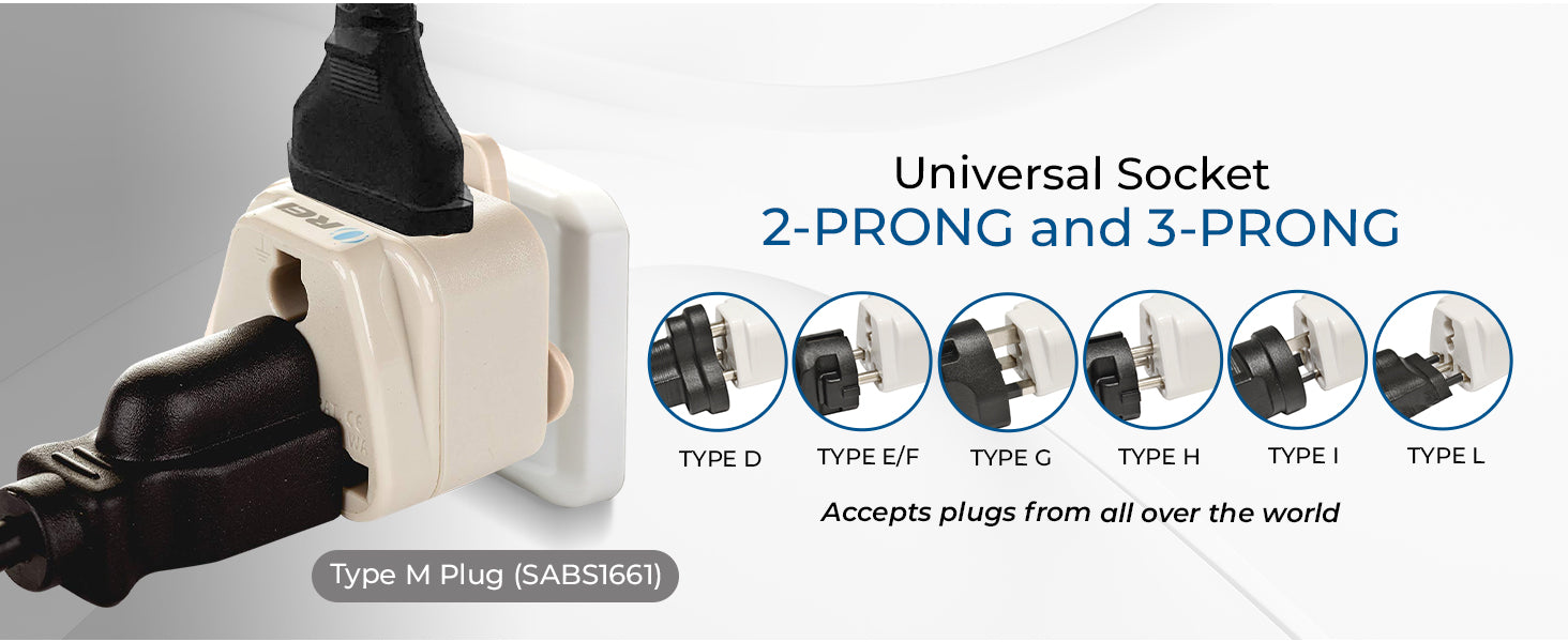 The adapter outputs a grounded 3-round-prong Type M plug (SABS 1661) suitable for compatible regions. It supports loads up to 3000W (250V, 13A), making it suitable for laptops, camera chargers, mobile devices, tablets, Bluetooth accessories, and other compatible electronics. Built for dependable performance, it supports a wide range of everyday devices.