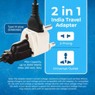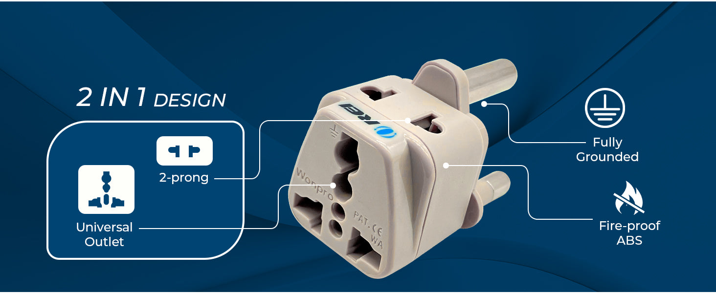 Featuring a dual-port input, the adapter allows two devices to be connected simultaneously. The universal input accepts plugs from most countries, while the secondary port supports 2-prong plugs from any region, offering added flexibility. This design helps reduce the need for multiple adapters when powering or charging multiple devices.