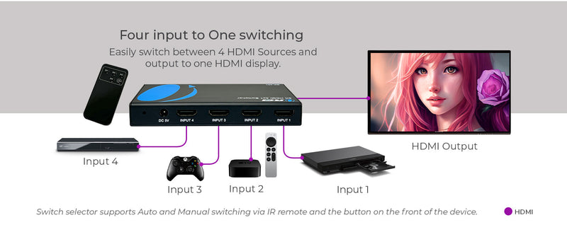 The 8K HDMI 4x1 switcher lets you connect four HDMI devices to a single display, easily managing multiple sources with the push of a front-panel button. Designed for quick, reliable switching, this switcher HDMI 4x1 is perfect for home theaters, gaming setups, video conferencing, and more. Simplify your AV experience with this versatile switch HDMI port solution.