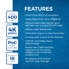 Designed for seamless integration, the UHD-EXB400R-K supports HDR, HDR10+, Dolby Vision, and HLG content, as well as bi-directional IR, RS-232, and CEC pass-through for complete control flexibility.