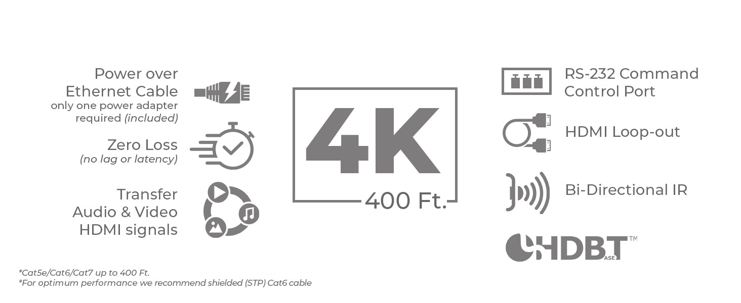 - Extended Transmission Distance – Supports up to 394 ft (120 m) for 4K and 492 ft (150 m) for 1080p over a single Cat5e/6 cable.