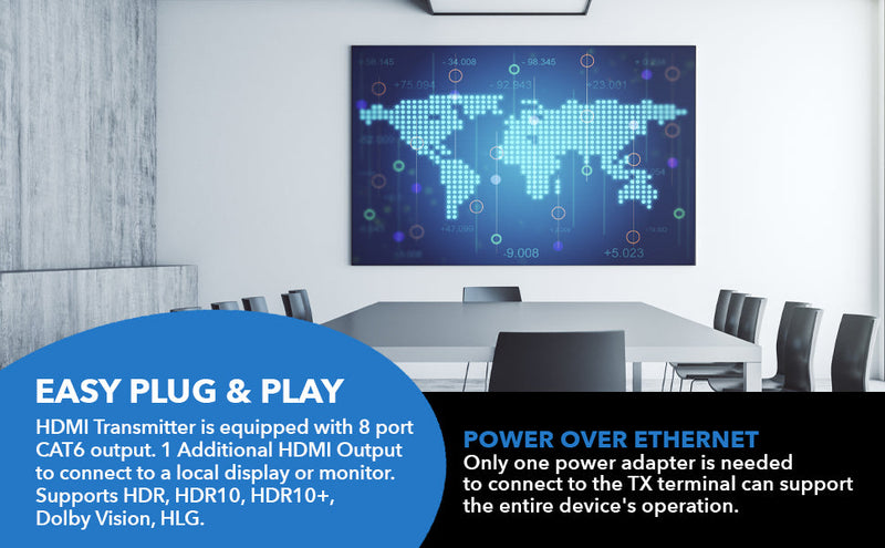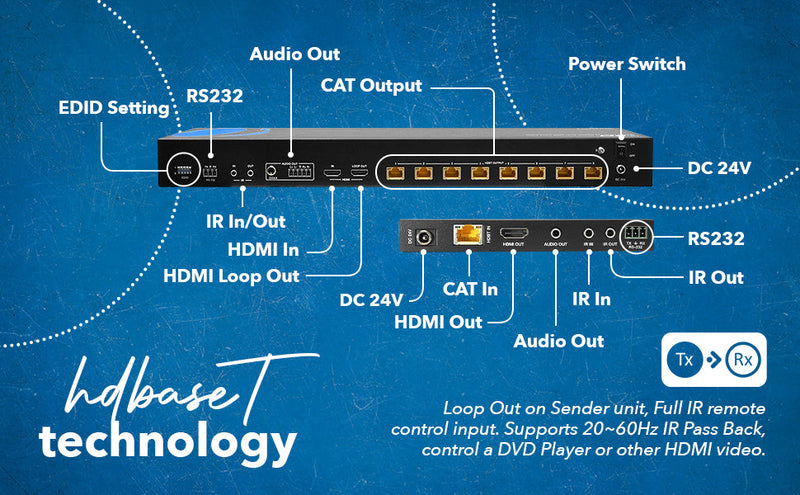 - HDMI loop-out on transmitter – Allows connection of a local display at the source location.