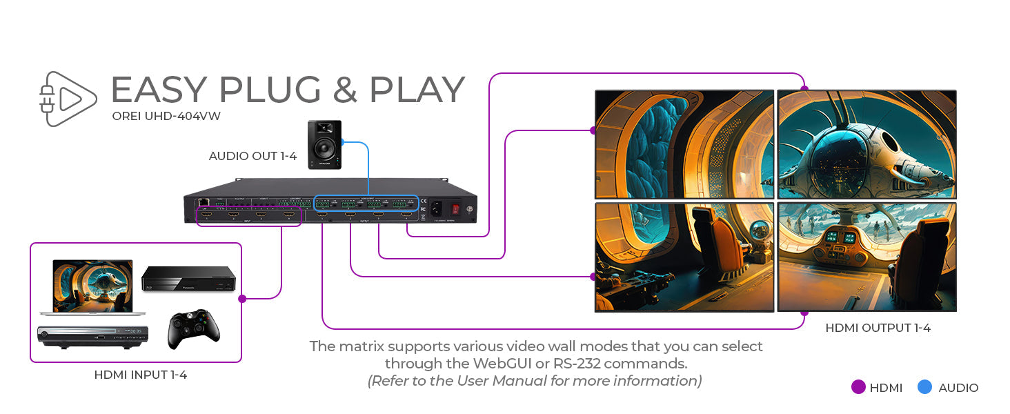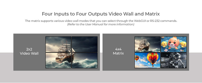 4K@60hz 4x4 HDMI™ Matrix w/ Video Wall (Seamless, Audio Extract)-UHD-404VW