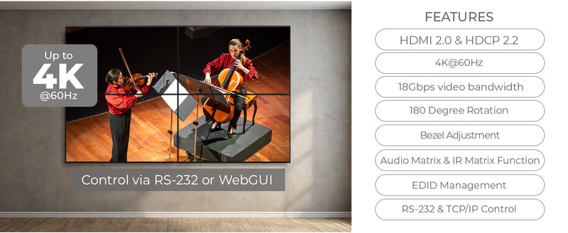 It also supports CEC pass-through, allowing centralized control over connected HDMI devices. External L/R audio input insertion, EDID customization, and multiple control interfaces (RS-232, LAN, front panel) make it ideal for command centers, conference rooms, digital signage, and AV integration projects.