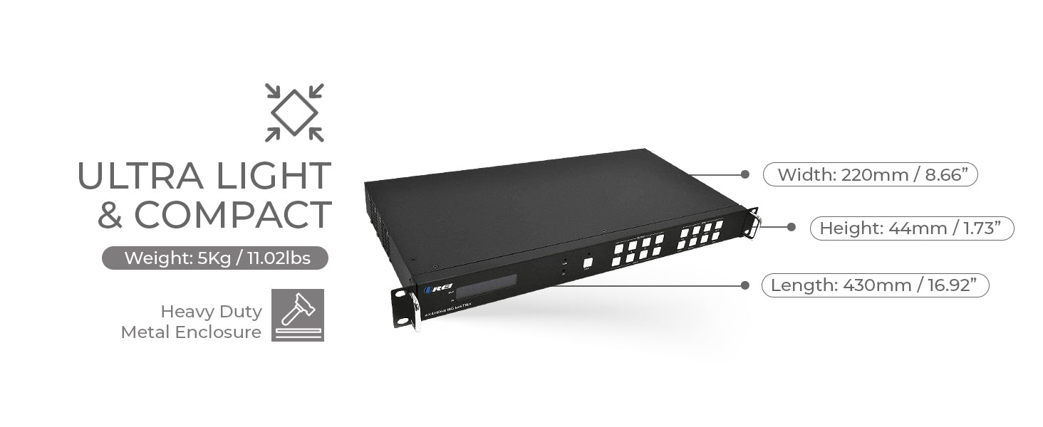 - Integrated Audio Matrix & IR Matrix – Independently route audio and IR signals across the matrix.