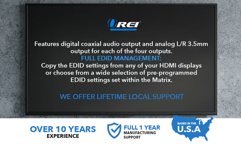 - Audio Outputs – Features digital coaxial audio and analog L/R 3.5mm outputs on each output channel for flexible audio distribution.