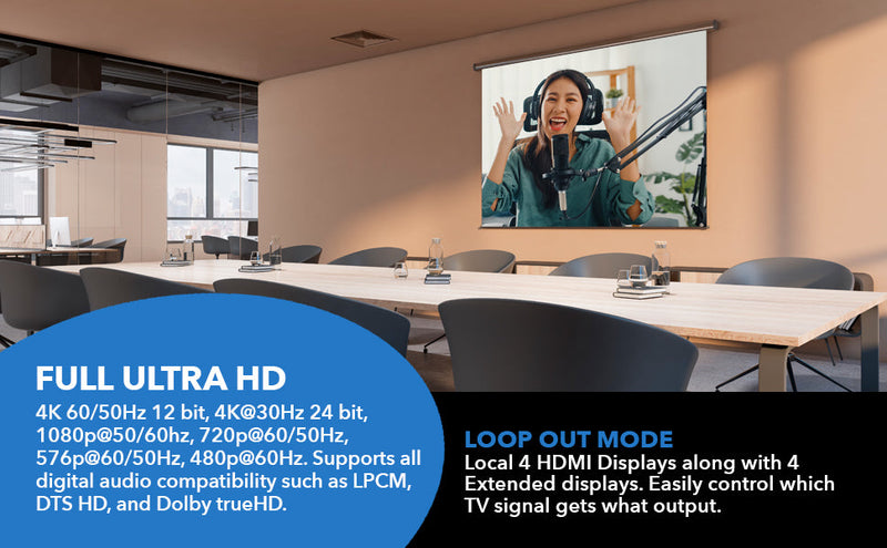 - Full Matrix Functionality with HDMI Loop-Out Mode – Enables simultaneous display on four local HDMI monitors and four HDBaseT extended remote displays with easy source selection per display.