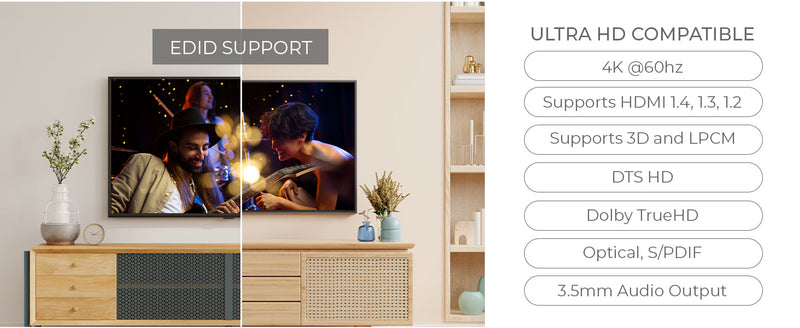 The UHDS-102A features an HDMI audio extractor, allowing you to extract audio through Optical and 3.5mm stereo outputs for flexible audio connectivity. It supports a wide range of advanced audio formats such as LPCM, Dolby Digital, Dolby TrueHD, DTS-96/24, and DTS-HD Master via HDMI, making it ideal for both 4K HDMI audio extractor setups and home theater systems. Enjoy clear, immersive sound alongside high-definition video when using this monitor display splitter for dual-screen setups.