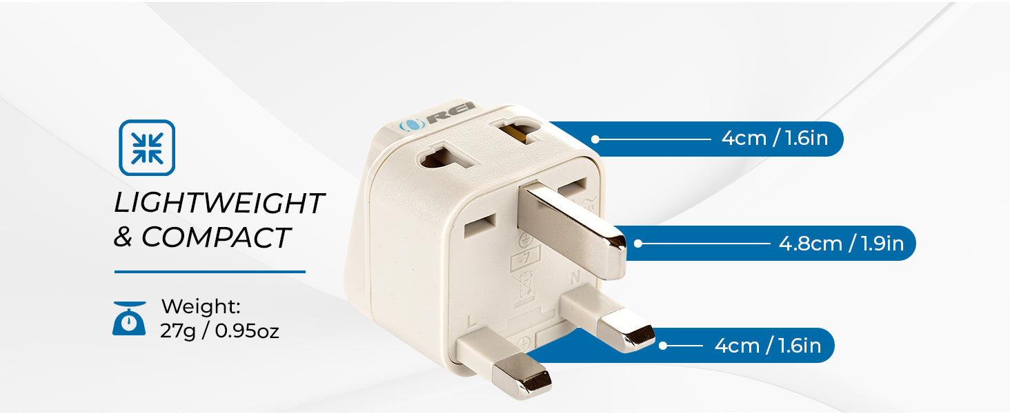 The DB-7-1PK is designed in the US and it’s our top choice for travel adapter to use in Type G outlets. It's compatible for use with dual voltage or worldwide voltage devices .It features one socket to connect a N. American 2-prong or a 3-prong power cord to charge your devices.