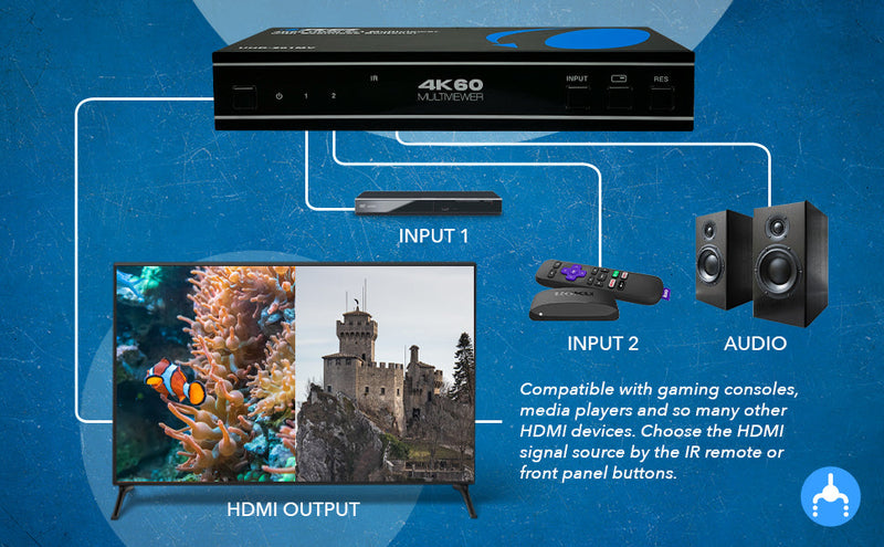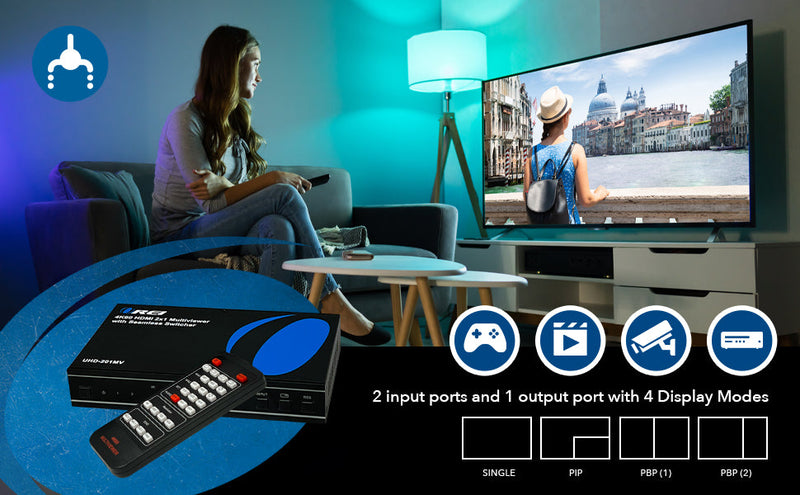 - 2 Inputs - 1 output HDMI Multiviewer switch