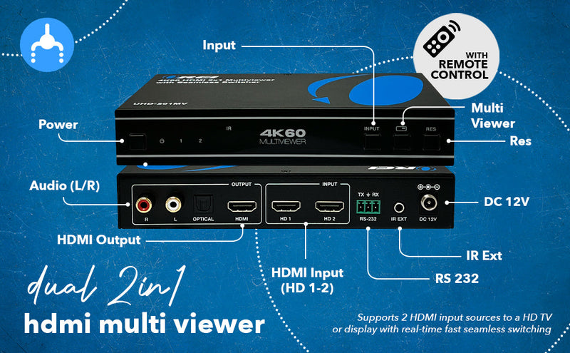 The 4K60 2x1 Multiviewer Seamless UHD Video Switcher is a high-performance tool designed to display and manage two HDMI video sources simultaneously on a single screen. Supporting resolutions up to 4K@60Hz 4:4:4, it delivers crisp and fluid visuals for even the most demanding applications.
