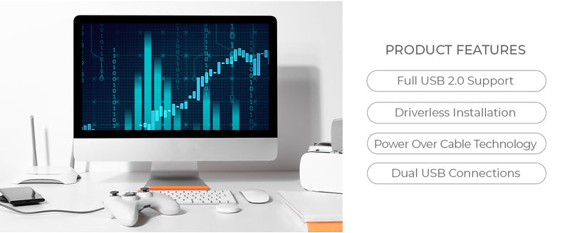 The transmitter connects to the host computer via a USB-B port, while the receiver offers two USB 2.0 outputs to connect your remote peripherals. The system is plug-and-play, requiring no driver installation, and the receiver unit is powered by a 5V/1A power adapter (included).