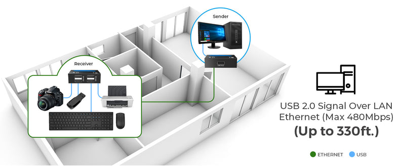The USB-EX330-K allows you to transmit USB 2.0 signals up to 330 feet using a single CAT6 or CAT7 cable. This USB over Ethernet solution is perfect for extending access to USB peripherals like printers, webcams, or flash drives across large spaces—ideal for commercial, educational, or home office environments.