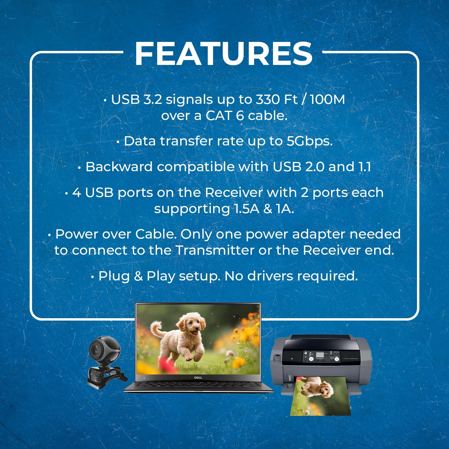 4-Port Receiver Hub – Includes four USB ports at the receiver: two rated for 1.5A and two for 1A to support a wide range of USB devices.