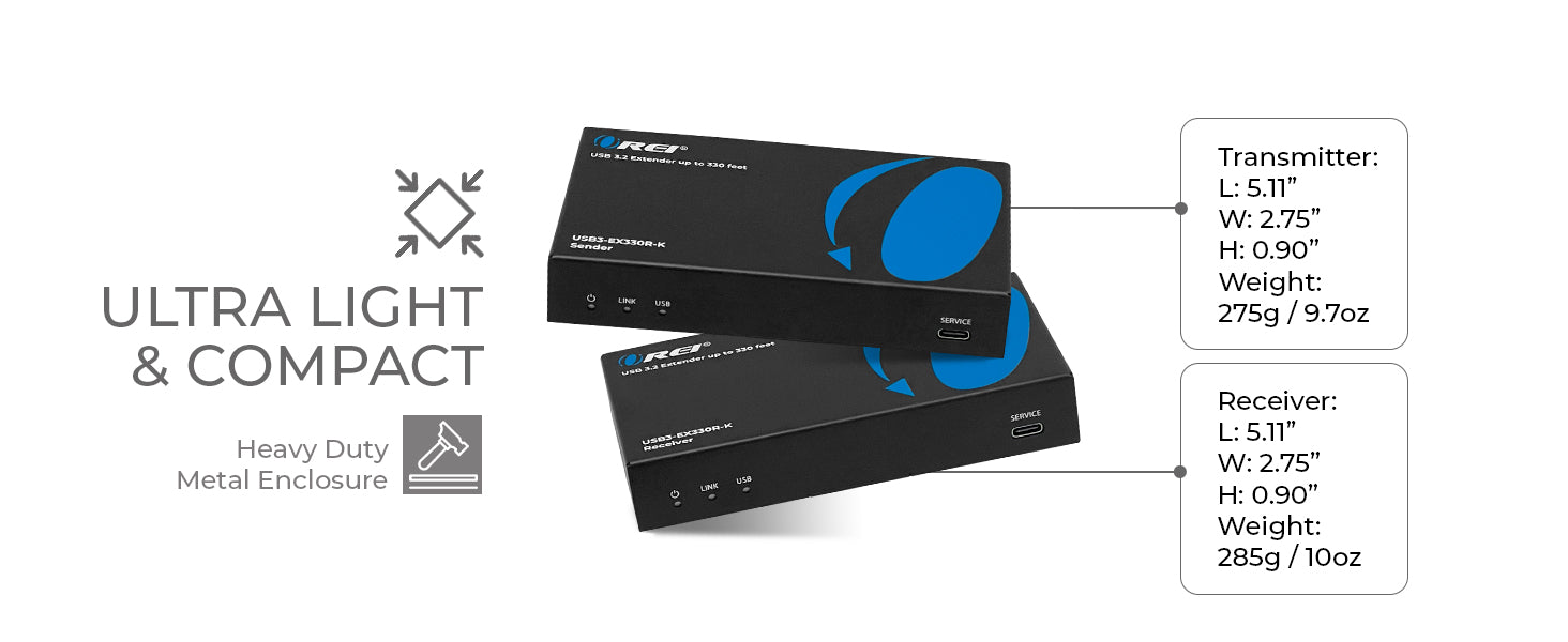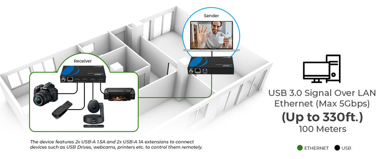 The USB3-EX330R-K USB extender enables long-distance USB 3.2 signal transmission up to 330 feet (100 meters) using a single CAT6/6A/7 cable. Ideal for setups where USB peripherals need to be accessed remotely—like conference rooms, classrooms, or security systems—this USB 3.0 extender over CAT6 ensures reliable performance without signal degradation.