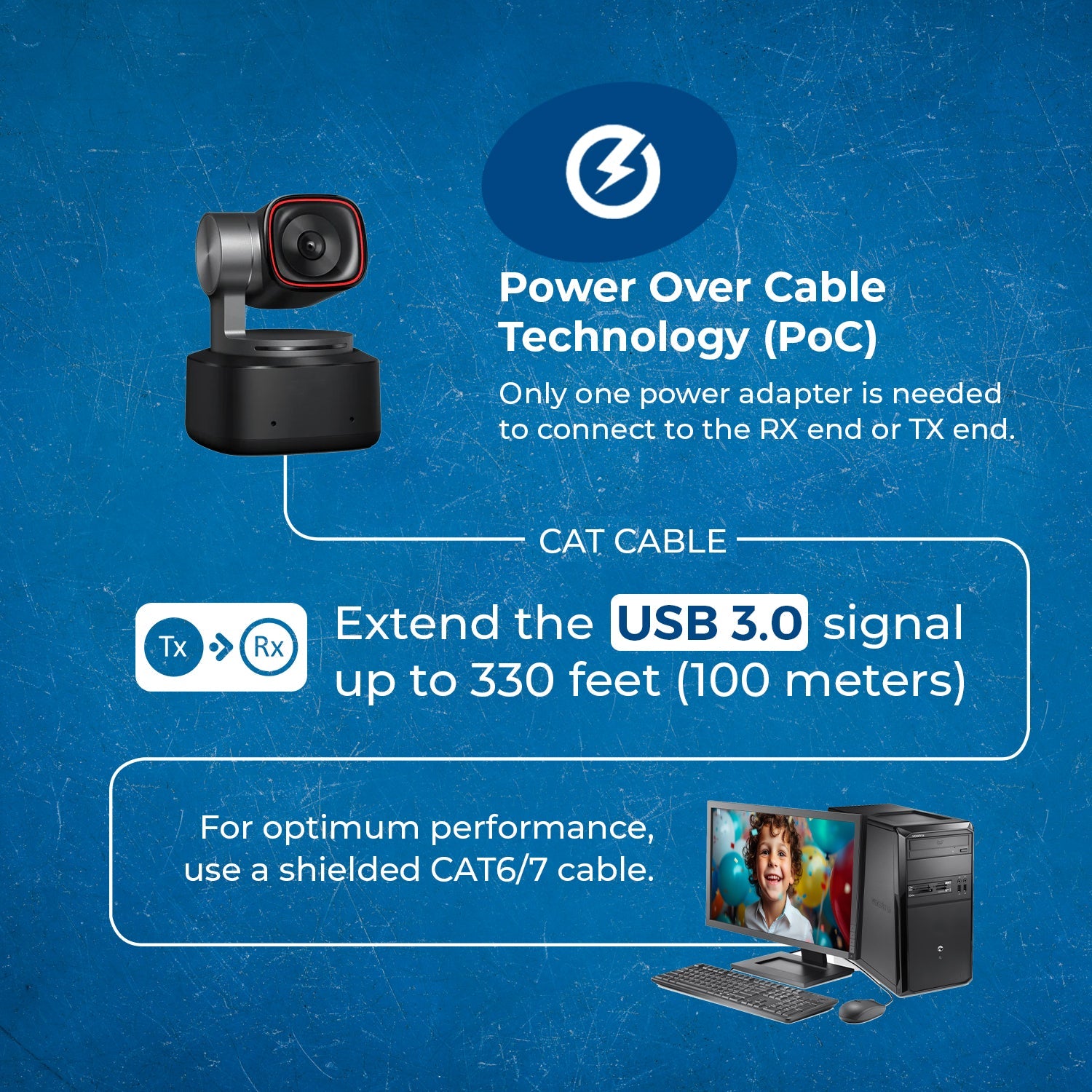 Long-Distance USB Extension – Extends USB 3.2 signals up to 330 ft (100 m) over a single CAT6/6A/7 cable.