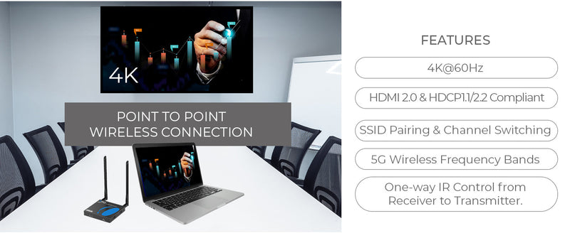 Operating on advanced 5G wireless frequency bands, this wireless HDMI extender 4K system ensures minimal interference, low latency, and a stable connection. Whether you're streaming UHD video or delivering a real-time presentation, the WUHD-165-K provides a seamless HDMI over wireless experience without the lag.