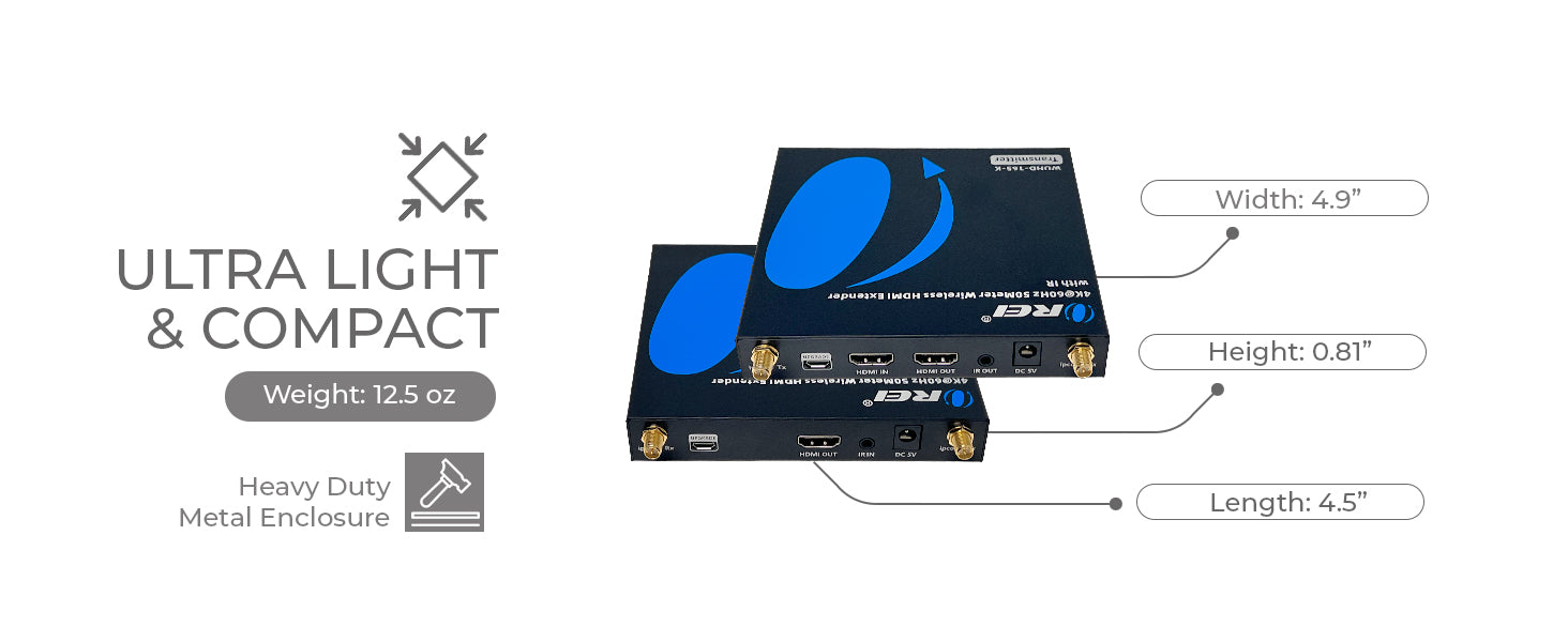 The WUHD-165-K HDMI wireless extender transmits stunning 4K@60Hz video up to 165 feet (50 meters) in clear line-of-sight conditions. Perfect for home theaters, conference rooms, or classrooms, this wireless HDMI transmitter eliminates cable clutter while maintaining exceptional video quality and reliability.